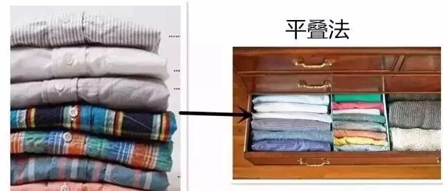 針對這種情況,可以換另一種疊法,平疊法,疊好的衣服豎起來,然后左右疊起,這樣的好處是既方便放衣服,也好拿衣服,如下圖;