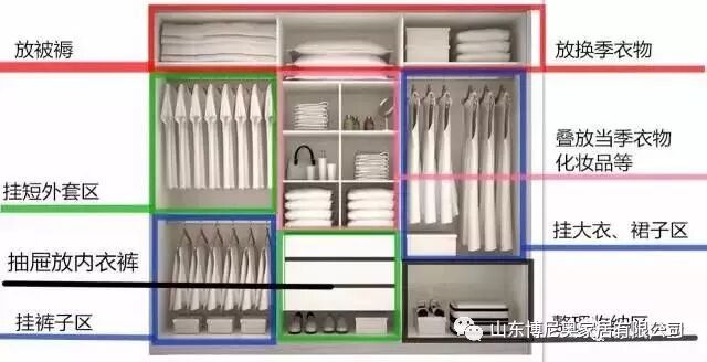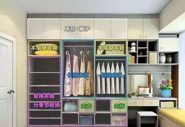 除了以上要注意的外,還要根據(jù)衣柜的功能分類設(shè)計,比如前面我們提到的,放被褥的,因為一年不常用,所以就安排在頂部柜。